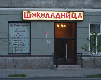 DescriptionTraveller’s and Mate have got a serious competitor. A chain coffee shop Shokoladnitsa, which is popular in Moscow and St. Petersburg, appeared in Krasnoyarsk. It was opened in the city center at Prospekt Mira, opposite to the Technological University. Visitors’ attention is attracted by a harmoniously decorated entrance group. There is a light sign hanging above the entrance. It is based on a light box, and the text is made of three-dimensional elements. All the colors used are calm ones – beige, chocolate and cherry. On the end of the building a two-sided light box is assembled. It can be seen by both road users and pedestrians. This coffee shop is the first of the three that are planned to be opened in the city. We hope that residents of Krasnoyarsk will enjoy pies and cakes served in Shokoladnitsa! |