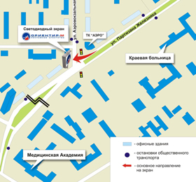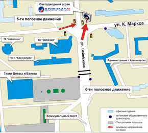 На сегодняшний день в г. Красноярске активно развивается Они являются неотъемлемой яркой частичкой любого динамично развивающегося мегаполиса. В декабре 2007 года компания «Ориентир-М» запустила два светодиодных экрана, Светодиодный экран на пересечении ул. К. Маркса и ул. Вейнбаума; CPT (стоимость тысячи контактов) - 0,9 руб. Светодиодный экран на пересечении ул. Партизана Железняка и ул. Аэровокзальной; CPT (стоимость тысячи контактов) - 1,6 руб. Наш телефон: 2-745-990 |