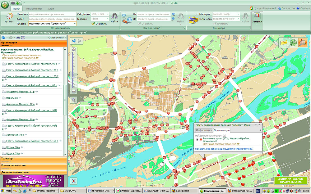 Работать с нами стало еще удобнее! Теперь в электронном справочнике Дубль Гис отмечены все рекламные конструкции, которые «Ориентир-М» готов предложить своим рекламодателям для размещения. Этот дополнительный сервис значительно упрощает процесс подбора стоек по интересующим клиента адресам. Данной функцией можно воспользоваться следующим образом: во вкладке «Поиск» выбрать строку «Рубрика», где задать запрос «Наружная реклама Ориентир-М». На экране появится список конструкций, распределенных по районам города и видам рекламных носителей. При этом каждая конструкция отмечена на карте города, что позволяет легко ориентироваться по ее месторасположению. Все очень просто и удобно! |