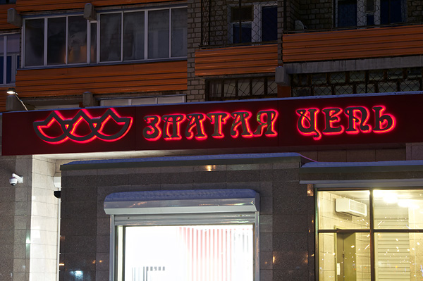 В ноябре компания Вывеска изготовлена по новой технологии и в фирменных цветах: буквы выполнены из металла, окрашенного специальной золотой краской. Подсветка осуществляется светодиодами, расположенными внутри букв. |