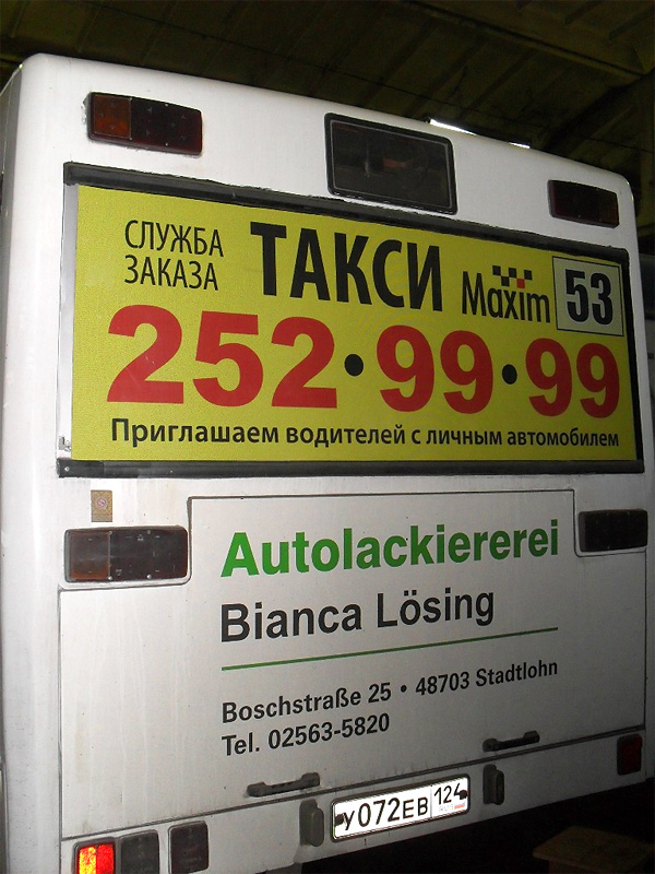 В Красноярске стремительно набирает обороты размещение рекламы на задних стеклах автобусах. Компанией «Ориентир-М» был произведен монтаж на 50-ти единицах транспорта для компании такси Максим. Такой масштабный проект был произведен компанией "Ориентир-М" в кратчайшие сроки. Благодаря такому количеству и грамотно составленной маршрутной программе охват города получился максимальным. Такси Максим предлагает услуги легкового, грузового такси, а также услугу «Трезвый водитель», с возможностью вызова через смс и icq. Цель рекламной кампании увеличение узнаваемости бренда, среди жителей города Красноярска, а так же привлечение новых водителей. Для решения поставленной цели была выбрана транзитная реклама. Такое размещение рассчитано на привлечение внимания автомобилистов и пешеходов. Макет разработан компанией такси Максим. |