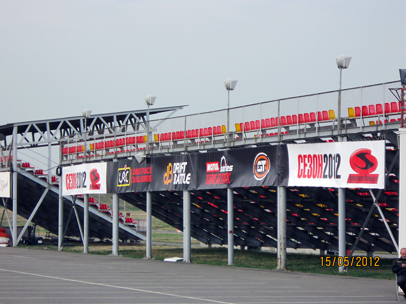 «Красное кольцо» открыло сезон серией заездов. К сезону 2012 было заказано новое оформление трибун и всей прилегающей территории. Компанией «Ориентир-М» в самые сжатые сроки было напечатано и замонтировано более 1000 м2 баннеров и перетяжек. Яркий дизайн и качественное исполнение не только способствует информированности пространства, но и существенно украшает территорию. |