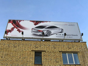 Во втором полугодии 2010г. набирает обороты по популярности в наружной рекламе – имиджевая реклама. А самым действенным и эффективным носителем при проведении имиджевых рекламных кампаний являются крупные крышные установки на зданиях. Вот и Audi в ноябре воспользовались нестандартным способом продвижения своего брэнда и разместили рекламу на крышной установке по адресу, К. Маркса, 44 – самой оживленной магистрали в центре города.