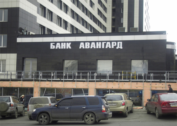 На красноярский рынок зашел один из крупнейших банков страны «Банк Авангард». Эффектная вывеска, выполненная из молочного акрила, стала лицом банка. Буквы были смонтированы на фасад из керамогранита, причем таким образом, что плиты фасада БЦ «Метрополь» были не повреждены (крепление приходилось в швы). Сложность работы также определила необходимость крепления к поверхности без несущих металлоконструкций.