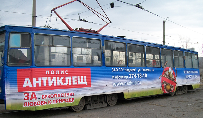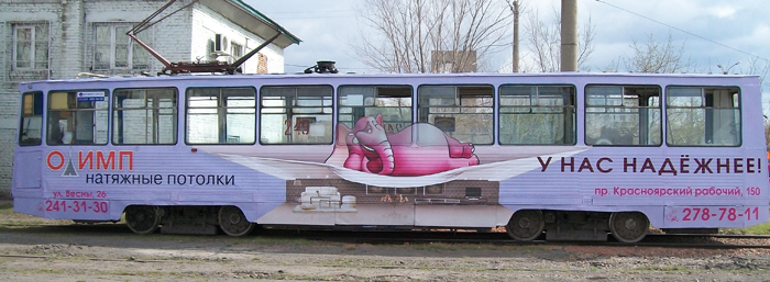 Реклама на транспорте всегда пользовалась популярностью, однако ее главным врагом остается грязь на дорогах. Но это не проблема для рекламы на трамваях! Трамвай передвигается по путям между двух автомобильных потоков, таким образом он всегда остается чистым и охватывает целевую аудиторию как среди пешеходов, так и среди автомобилистов. К тому же, трамвай это 55 кв. метров для воплощения даже самого смелого макета. В апреле компания «Ориентир-М» разместила два таких ярких и креативных макета. Нежно-фиолетовый трамвай с ярко-розовым слоном демонстрирует качество и надежность натяжных потолков. Также сезон наступил и для ЗАО «Надежда», красивый синий трамвай призывает граждан застраховать себя от последствий укуса клеща. Реклама натяжных потолков.
