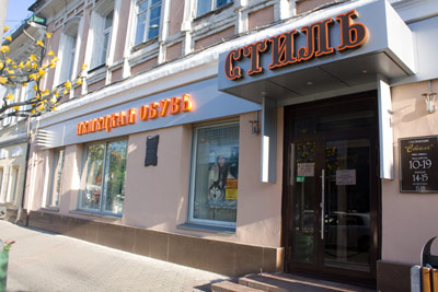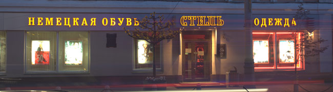 Входная группа ТД «Стиль» удачно сочетает в себе простоту и элегантность, идеально вписываясь в историческую часть города. Такого эффекта удалось достичь благодаря сочетанию правильных сдержанных форм и оригинальной внешней подсветки. Для изготовления основы и козырька использовались кассеты серебристо-серого АКМ. Прием частичной засветки букв «Стиль» был выполнен за счет сочетания пленок с разными характеристиками. |