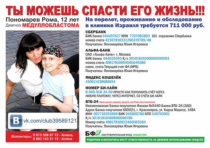 Компания «Ориентир-М» оказала финансовую помощь Пономареву Роману. У Романа страшный диагноз Медуллоблластома «опухоль головного мозга». К сожалению, медицина в нашем государстве пока ничем не может помочь Роману. На перелет, проживание и обследование в клинике Израиля Роме требуется 711 000 руб. Сбор средств продолжается. Надеемся на успешное лечение и выздоровление Романа.