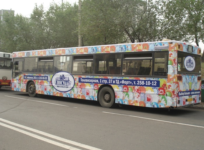 С лета 2012г. сеть магазинов «Посуда Центр» размещает бортовую рекламу на городском транспорте. Компания «Ориентир-М» произвела размещение рекламы с полным брендированием больших автобусов типа МАN, что позволяет донести максимум информации о данном товаре до потенциального покупателя. Выбранный автобусный маршрут с ярким, красочным дизайном, охватывает все оживленные улицы левого берега от Октябрьского до Советского районов.