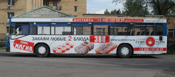 Компания «Суши Терра», владеющая сетью ресторанов суши и кофейн, проводит новую выгодную акцию от службы доставки «Суши Магия»! Помощь в проведении рекламной кампании оказала компания «Ориентир-М». Акция рассчитана на 3 летних месяца с охватом центральных районов города. Для носителя были выбраны автобусы МАН.
