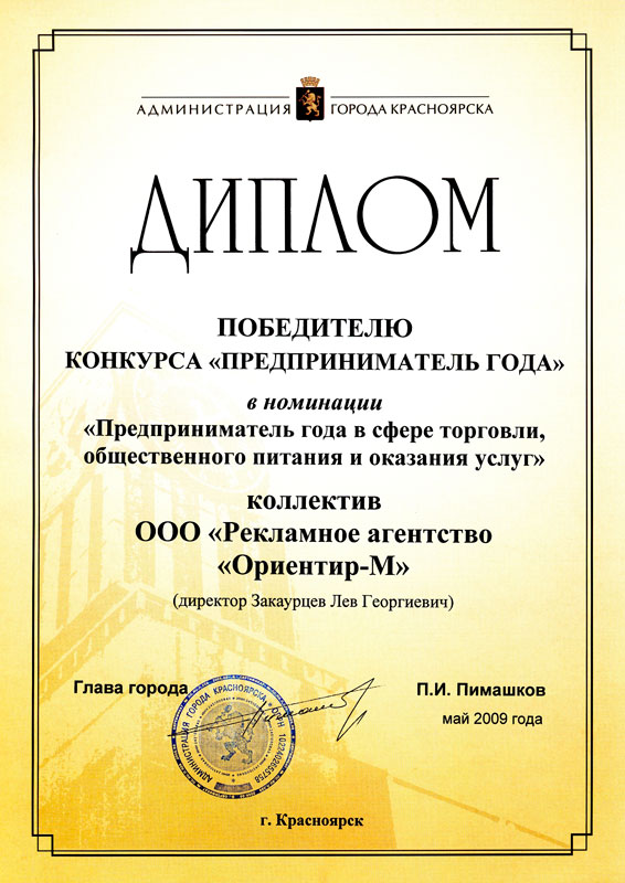 Компания «Ориентир-М» в лице нашего генерального директора Льва Георгиевича Закаурцева удостоена высокой награды. Сегодня 27 мая в деловом центре «Сибирь» прошло вручение наград победителям конкурса «Предприниматель года», проводимого в рамках городской целевой программы «Поддержка и развитие малого и среднего предпринимательства в городе Красноярске» на 2009 – 2011 годы». Наша компания стала победителем в номинации «Предприниматель года в сфере торговли, общественного питания и оказания услуг». Наша победа - еще один показатель стабильности, профессионализма, высокой социальной ответственности компании, лидерства. Это еще один стимул добиваться лучших результатов и выводит качество обслуживания на еще более высокий уровень.