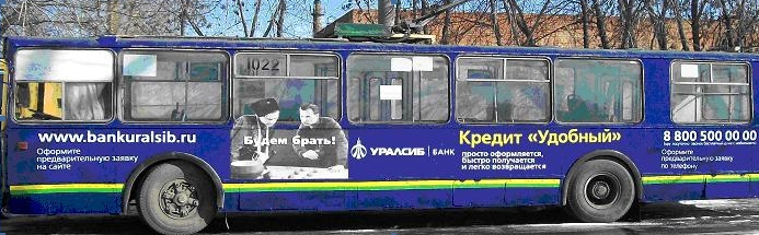 Банк «УралСиб» запустил масштабную рекламную кампанию на 20 единицах электротранспорта г. Красноярска, задействовав как троллейбусы, так и трамваи. На бортах представлен новый тариф потребительского кредитования физических лиц – Кредит «Удобный». Сложно не заметить данную рекламную кампанию: