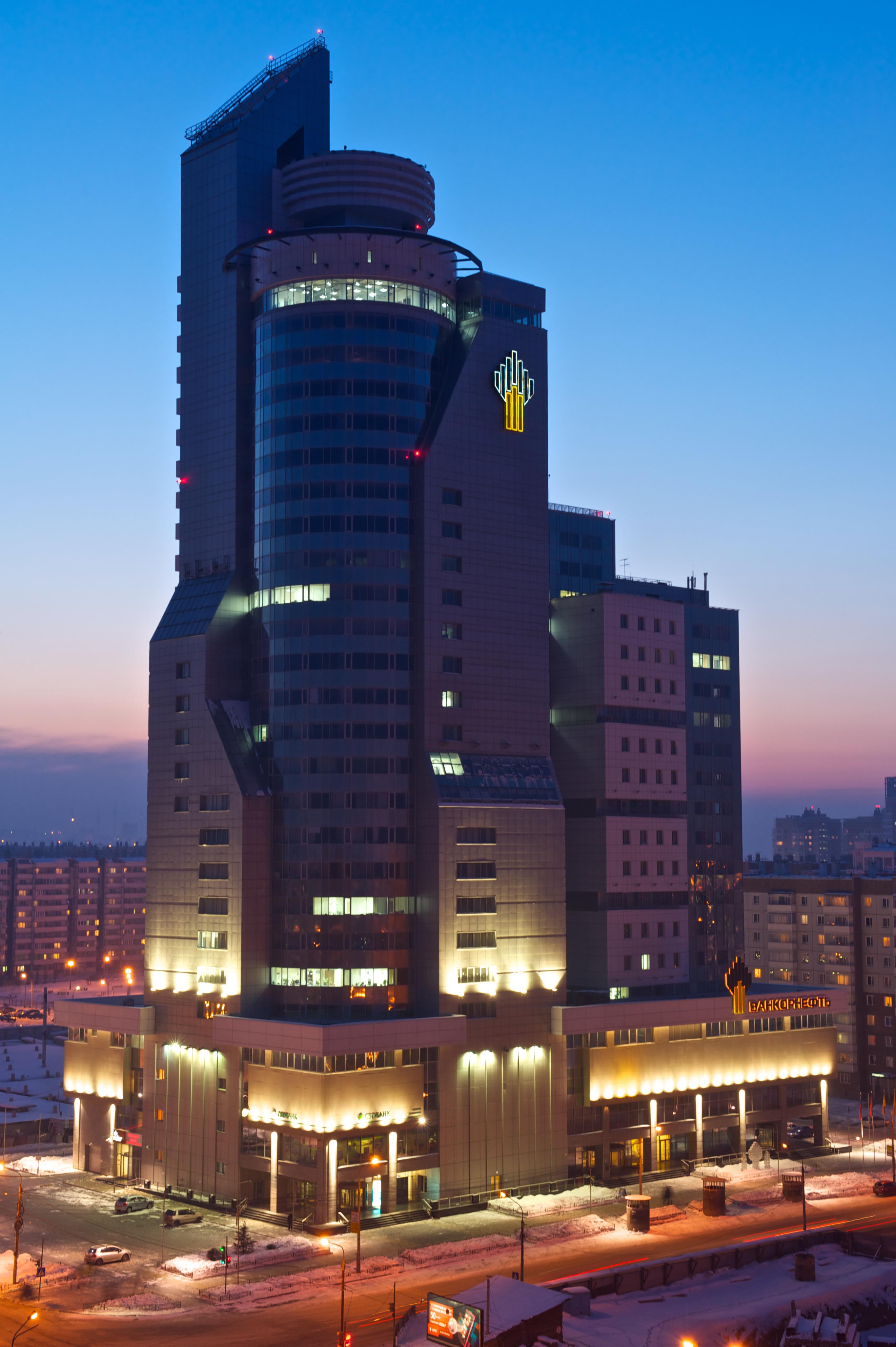 На самом высоком здании Красноярска БЦ «Первая башня» появились вывески «Ванкорнефть», которые действительно очень сложно не заметить! Световой логотип находится на уровне 90 метров над землей. Его высота – три с половиной этажа. Конструкция выполнена из окрашенной стали, подсветка – открытый неон. Ее удержит мощная несущая рама. Сложность монтажа определила не только высота, на которой пришлось работать, но и погодные условия – часть работ велась при температуре минус 30 градусов. Вывеска «Ванкорнефть» , расположенная над входом в здание, имеет габариты 16,5 на 6,5м. Буквы и логотип изготовлены также из стали. Вывеска подсвечена светодиодами, установленными внутри элементов. Монтаж конструкций потребовал разборки части обшивки фасада здания. Обе вывески изготовлены с учетом всех требований безопасности и сертификации. Данная работа – один из самых сложных заказов Компании «Ориентир-М». Он уникален для нашего города.