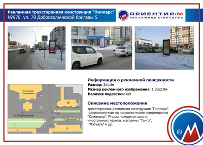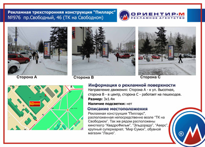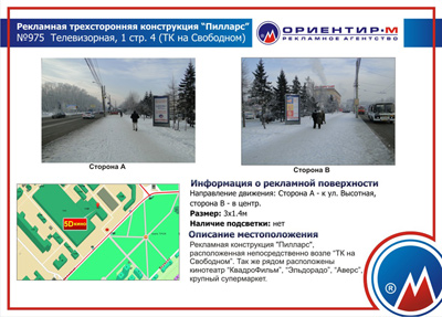 Компания Ориентир-М установила три новых конструкции типа «пилларс» в самых выигрышных местах: ТК на Свободном (2 установки) и ул. 78 Добровольческой Бригады.